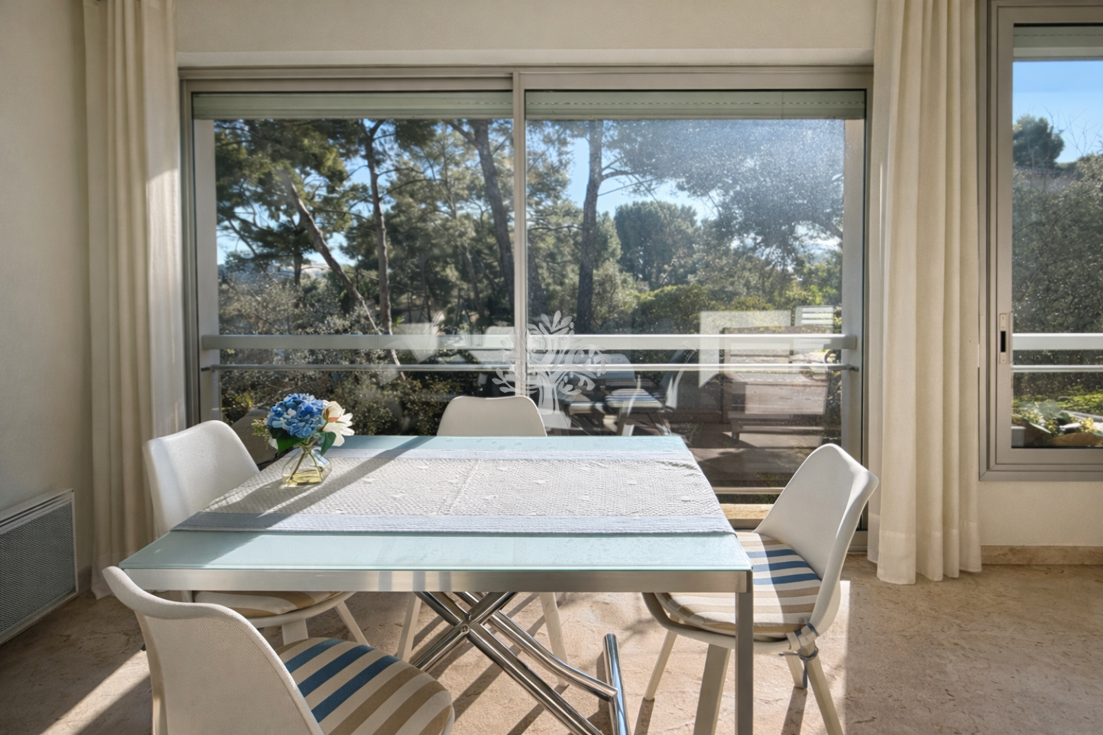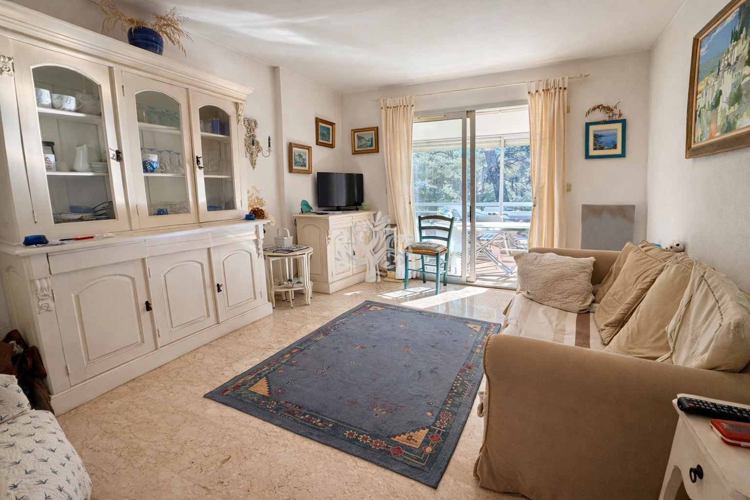 Sa terrasse fermée surplombe les jardins de la résidence, offrant un cadre apaisant.