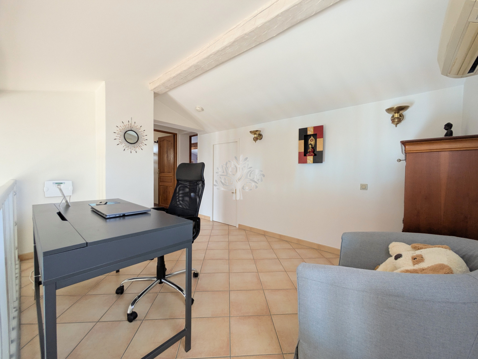 A l'étage, 2 chambres, un bureau en mezzanine, une salle de bains avec un wc + des combles aménagés qui sont utilisés en pièce de rangement.