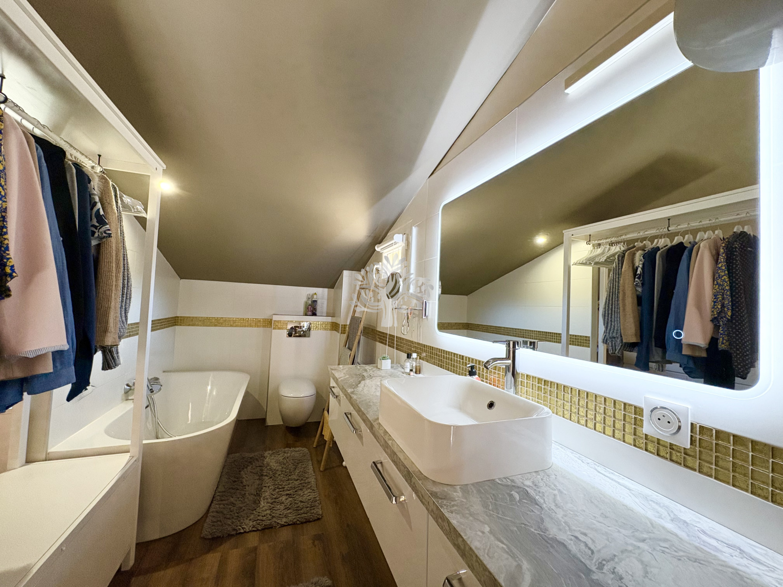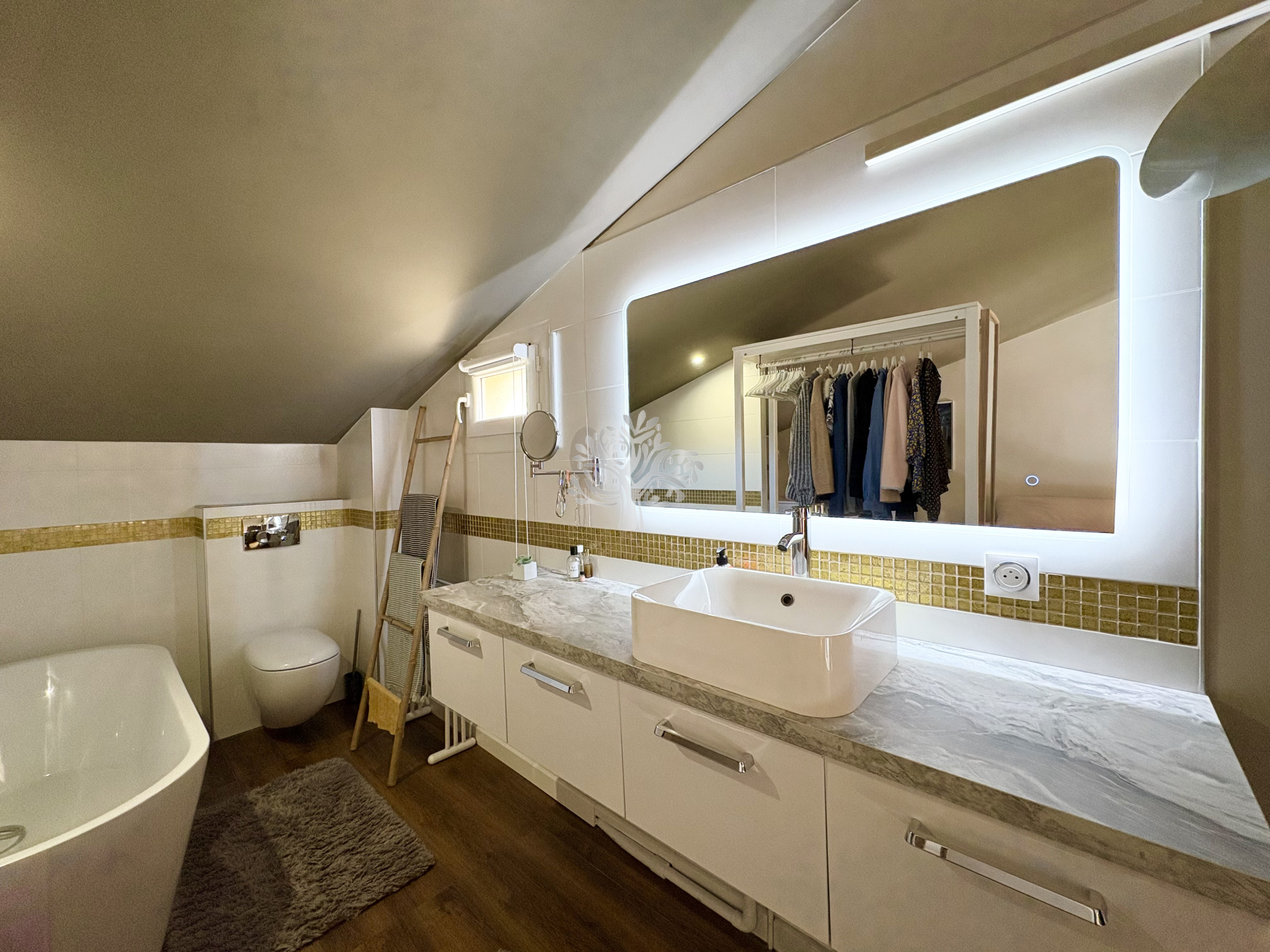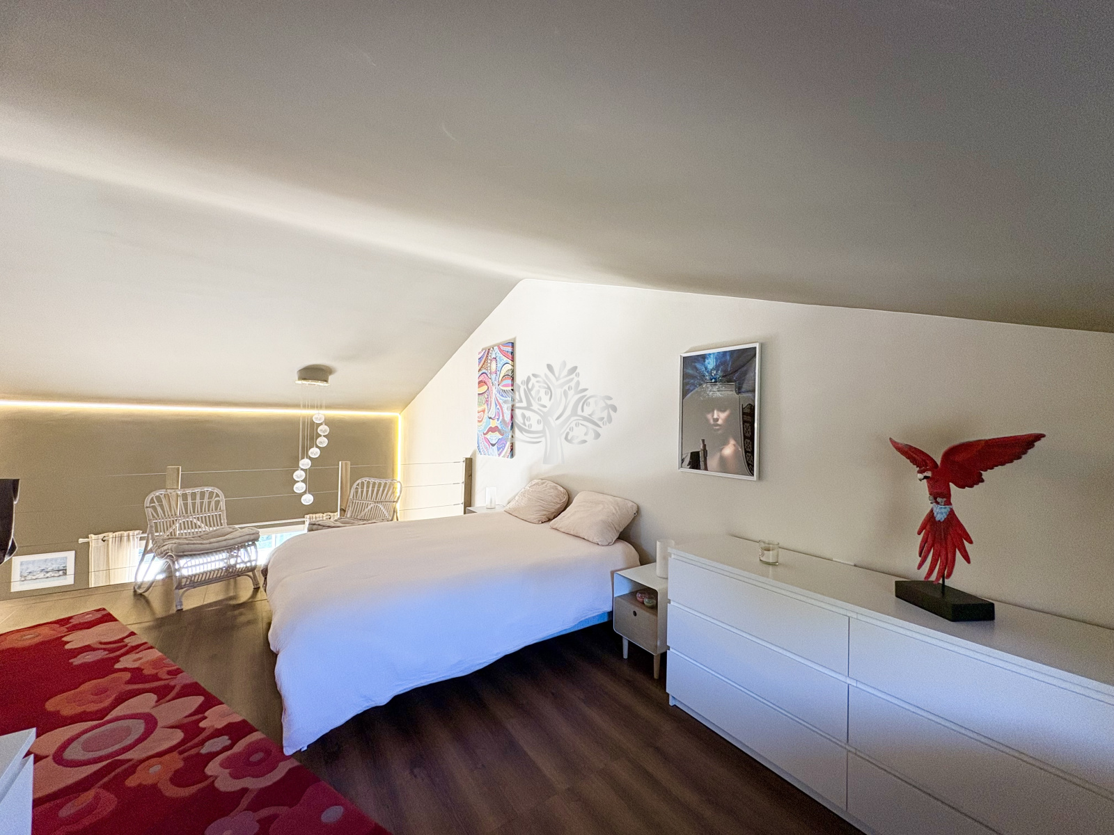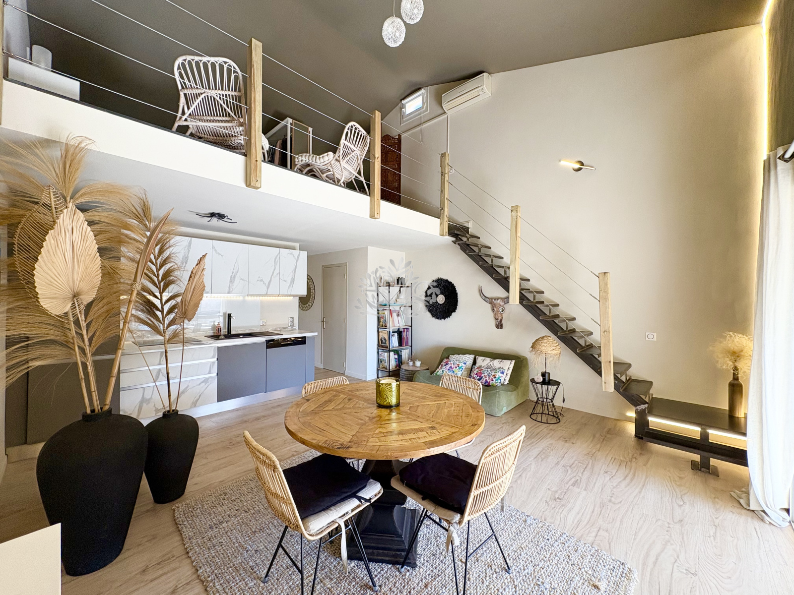 Montez à l'étage grâce à un escalier design pour y découvrir une spacieuse mezzanine de 20 m² comprenant un grand espace nuit et une salle de bain avec WC.