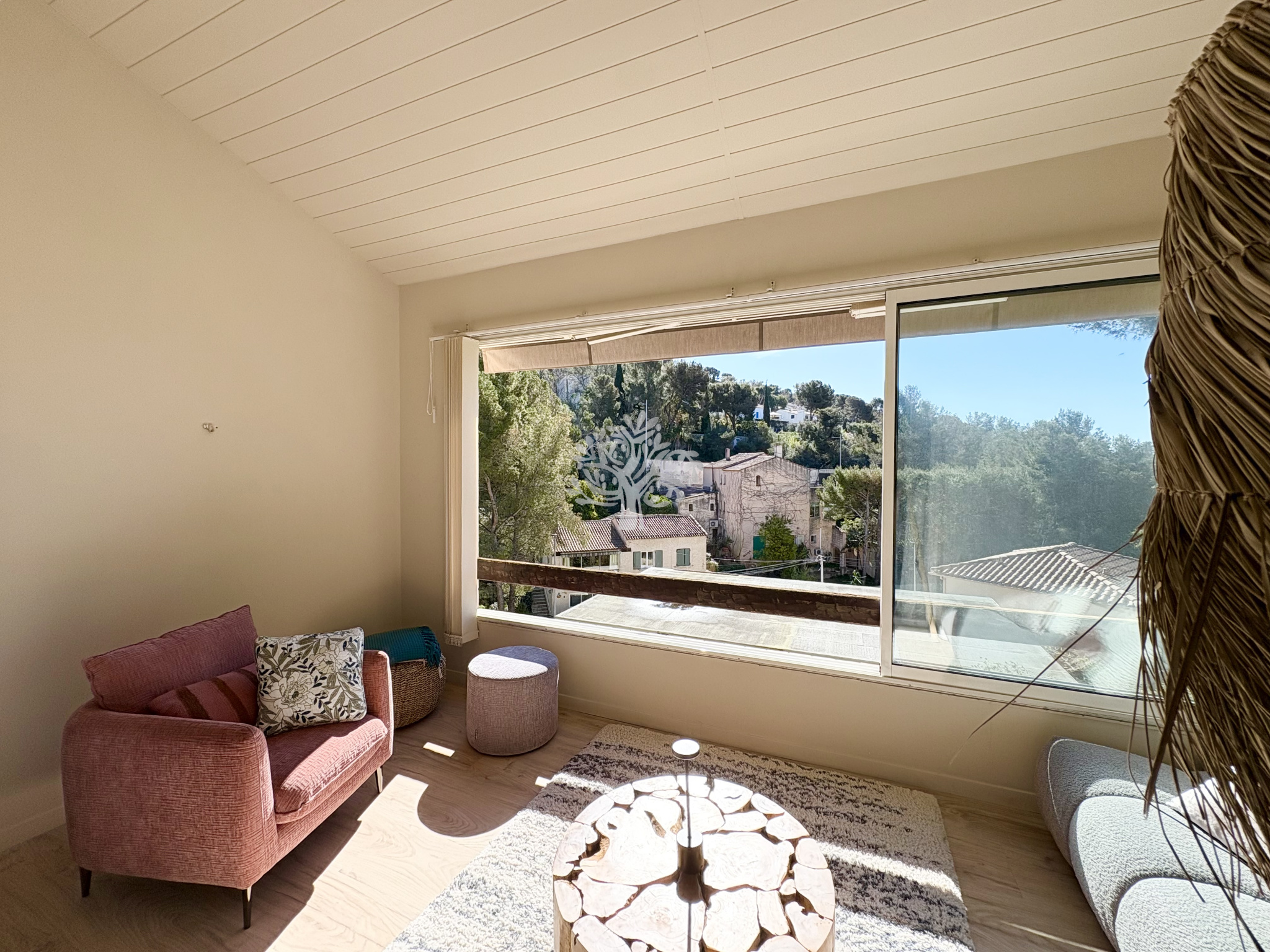 Au rez-de-chaussée, un espace de vie avec cuisine ouverte d'environ 30 m², donnant sur une véranda baignée de lumière avec une vue verdoyante et un bel aperçu mer.
