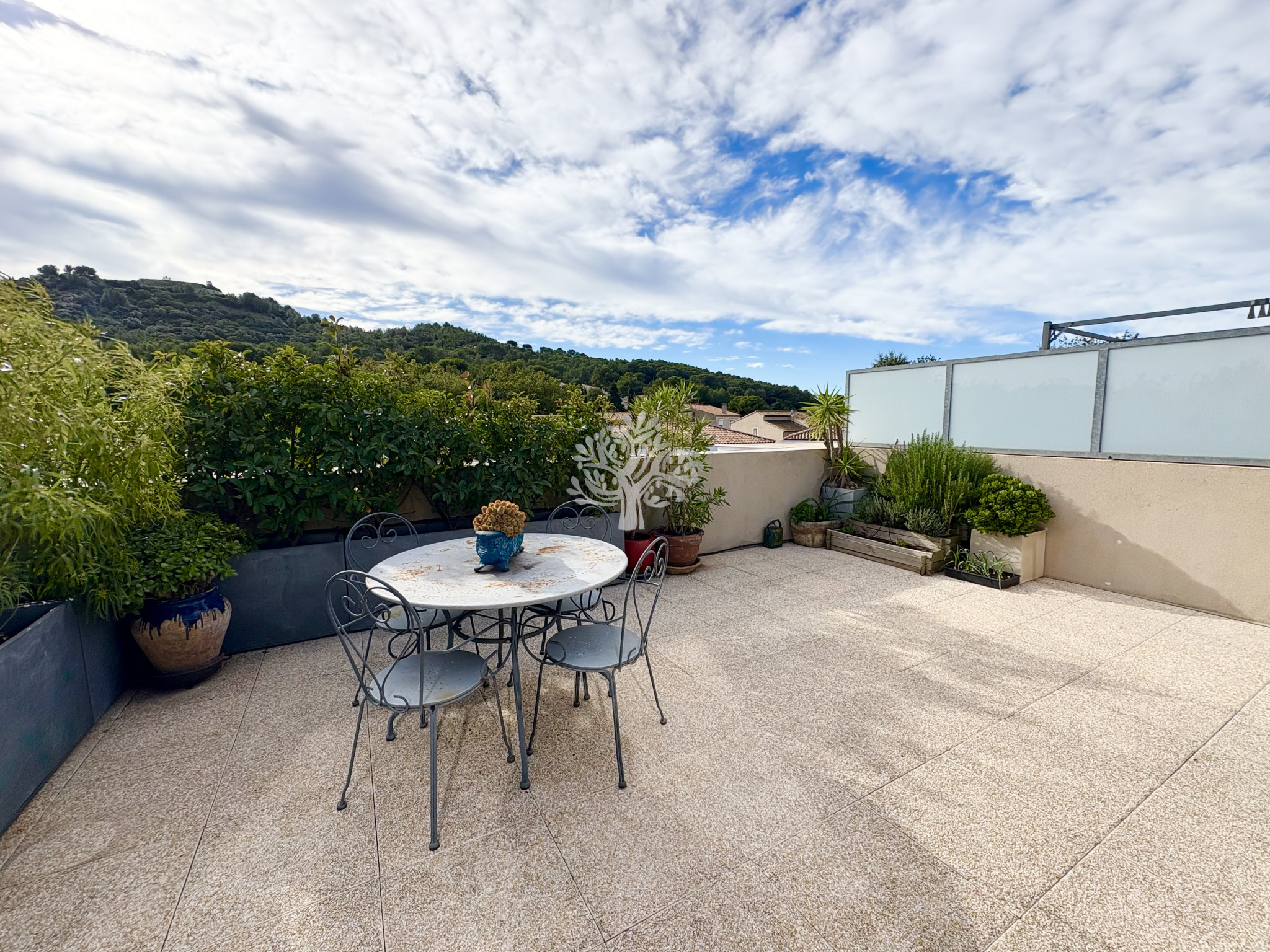 Il se compose d’un vaste séjour lumineux donnant sur une grande terrasse de 60 m², d’une cuisine fermée entièrement équipée, de deux chambres confortables avec possibilité d’en créer une troisième, de deux salles de bains et d’un WC séparé.