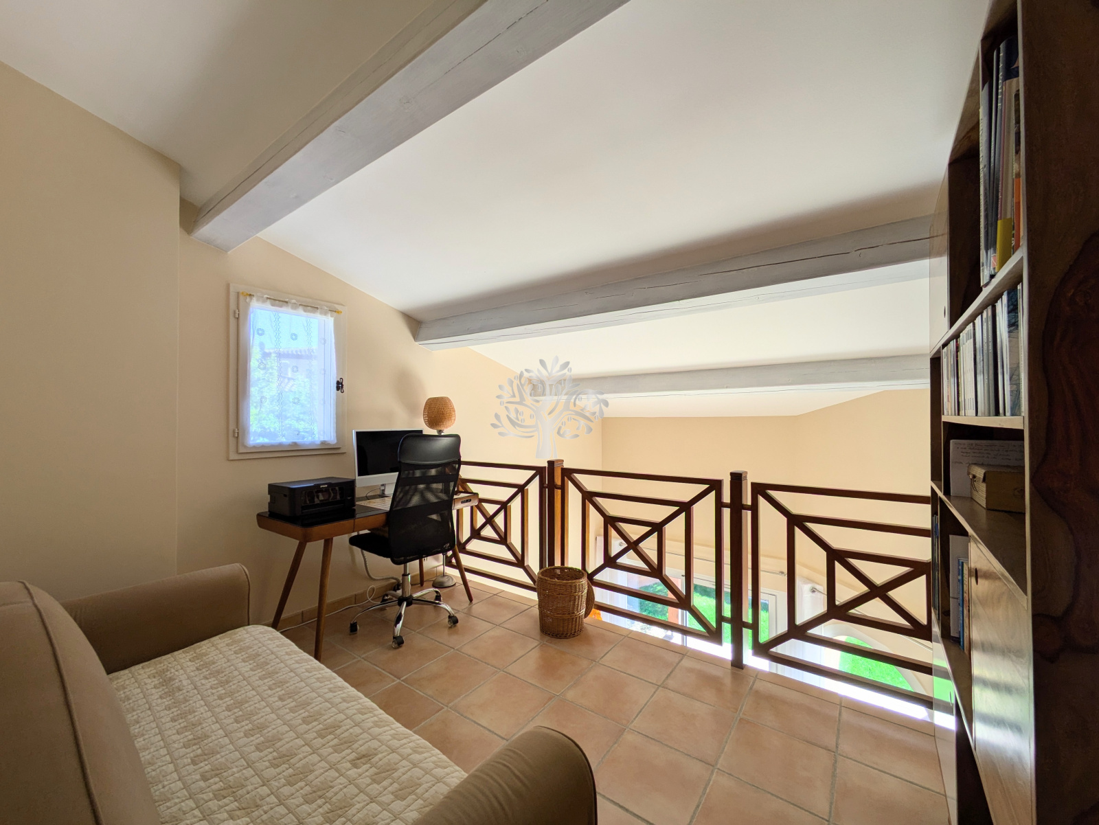 Au 1er étage, 2 chambres ainsi qu'un espace bureau en mezzanine, une salle d'eau et un wc séparé.